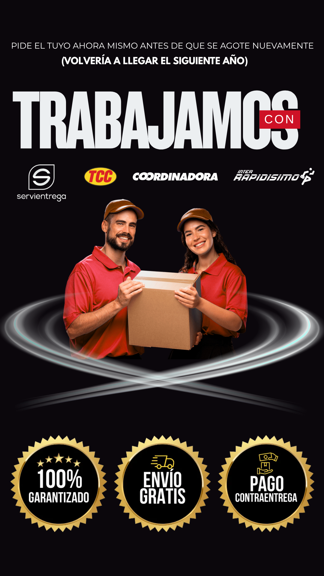 Manejamos envíos gratis con servicio pago contra entrega a todo el país nuestro. Tiempo de entrega es de 2 a 4 días hábiles a ciudades principales y 5 a 7 días hábiles a otros municipios. Recuerda tener el dinero completo en EFECTIVO en el momento de la entrega para que no tengas novedades con la recepción de tu pedido.