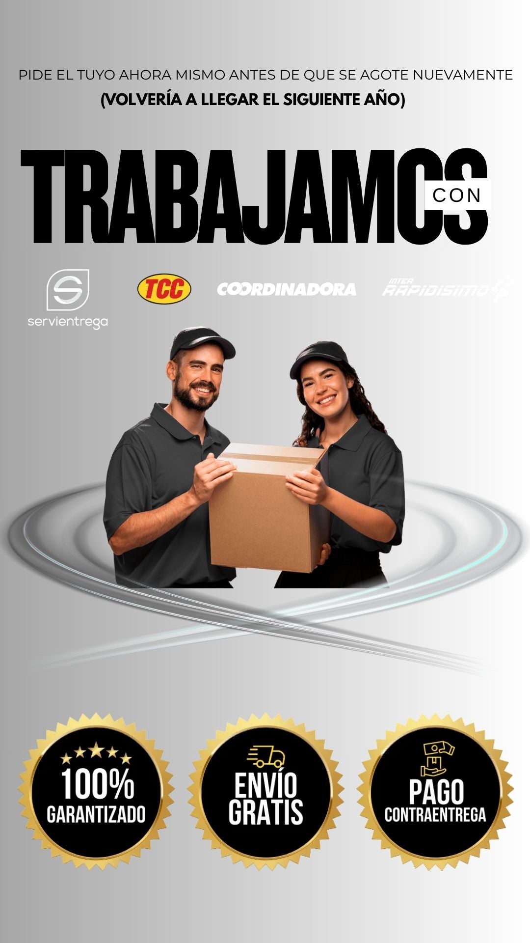Manejamos envíos gratis con servicio pago contra entrega a todo el país nuestro. Tiempo de entrega es de 2 a 4 días hábiles a ciudades principales y 5 a 7 días hábiles a otros municipios. Recuerda tener el dinero completo en EFECTIVO en el momento de la entrega para que no tengas novedades con la recepción de tu pedido.