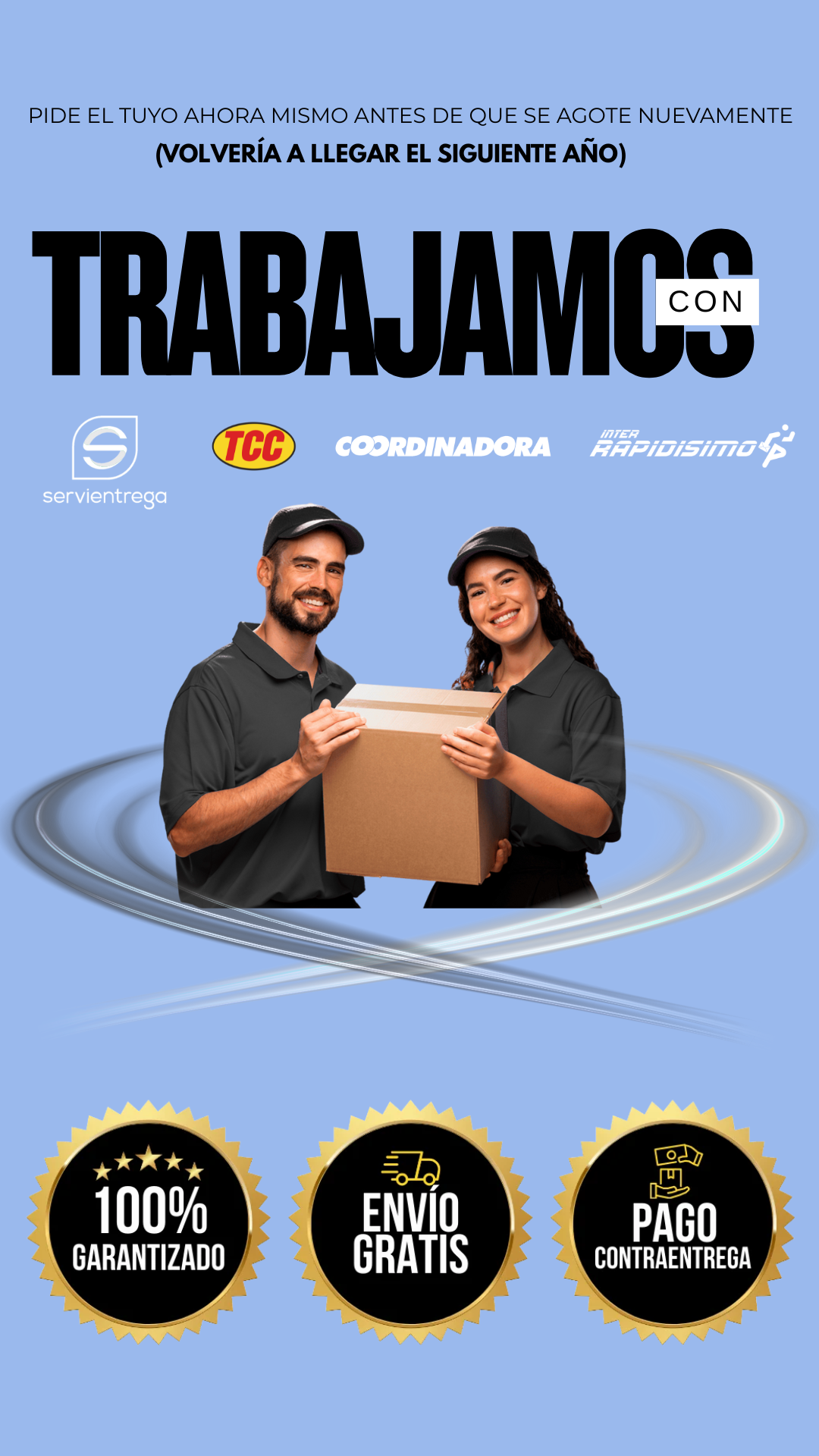 Manejamos envíos gratis con servicio pago contra entrega a todo el país nuestro. Tiempo de entrega es de 2 a 4 días hábiles a ciudades principales y 5 a 7 días hábiles a otros municipios. Recuerda tener el dinero completo en EFECTIVO en el momento de la entrega para que no tengas novedades con la recepción de tu pedido.