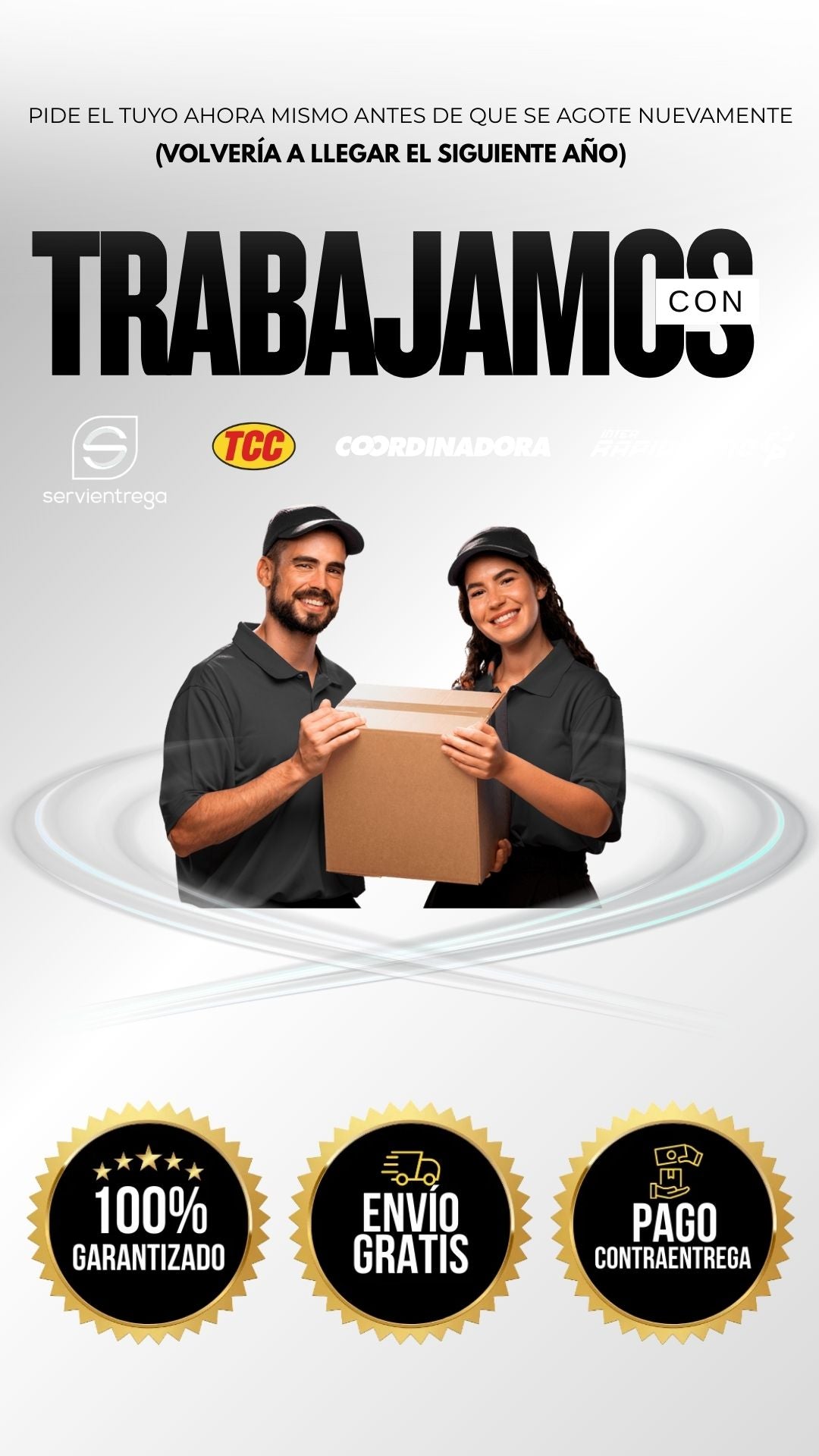 Manejamos envíos gratis con servicio pago contra entrega a todo el país nuestro. Tiempo de entrega es de 2 a 4 días hábiles a ciudades principales y 5 a 7 días hábiles a otros municipios. Recuerda tener el dinero completo en EFECTIVO en el momento de la entrega para que no tengas novedades con la recepción de tu pedido.